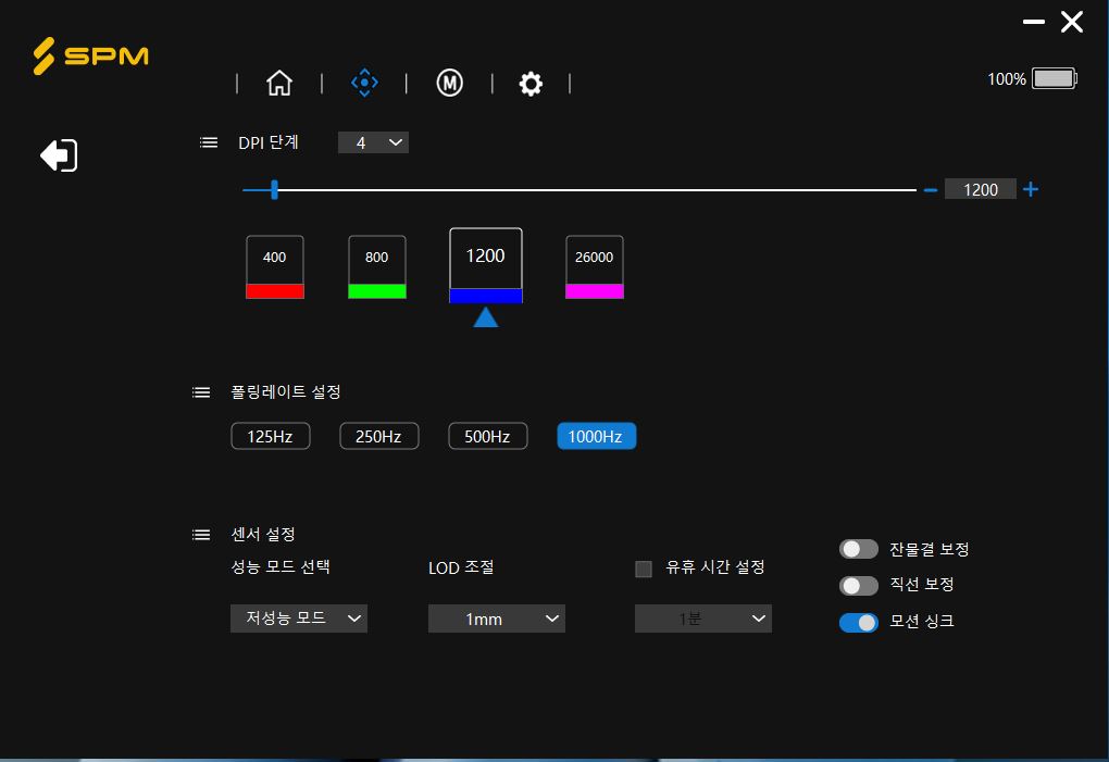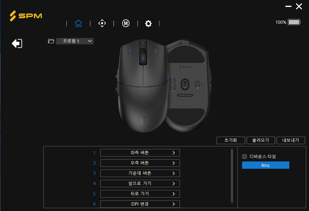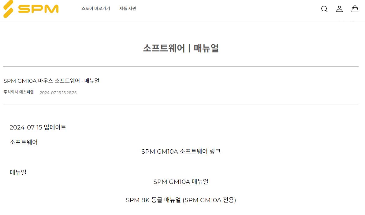 SPM 홈페이지에서 '제품 지원 → SPM GM10A 마우스 소프트웨어'를 다운로드하여 설치를 진행했습니다. 유선 또는 무선 연결이 완료되면 소프트웨어에서 현재 제품의 모델명을 확인할 수 있습니다.
