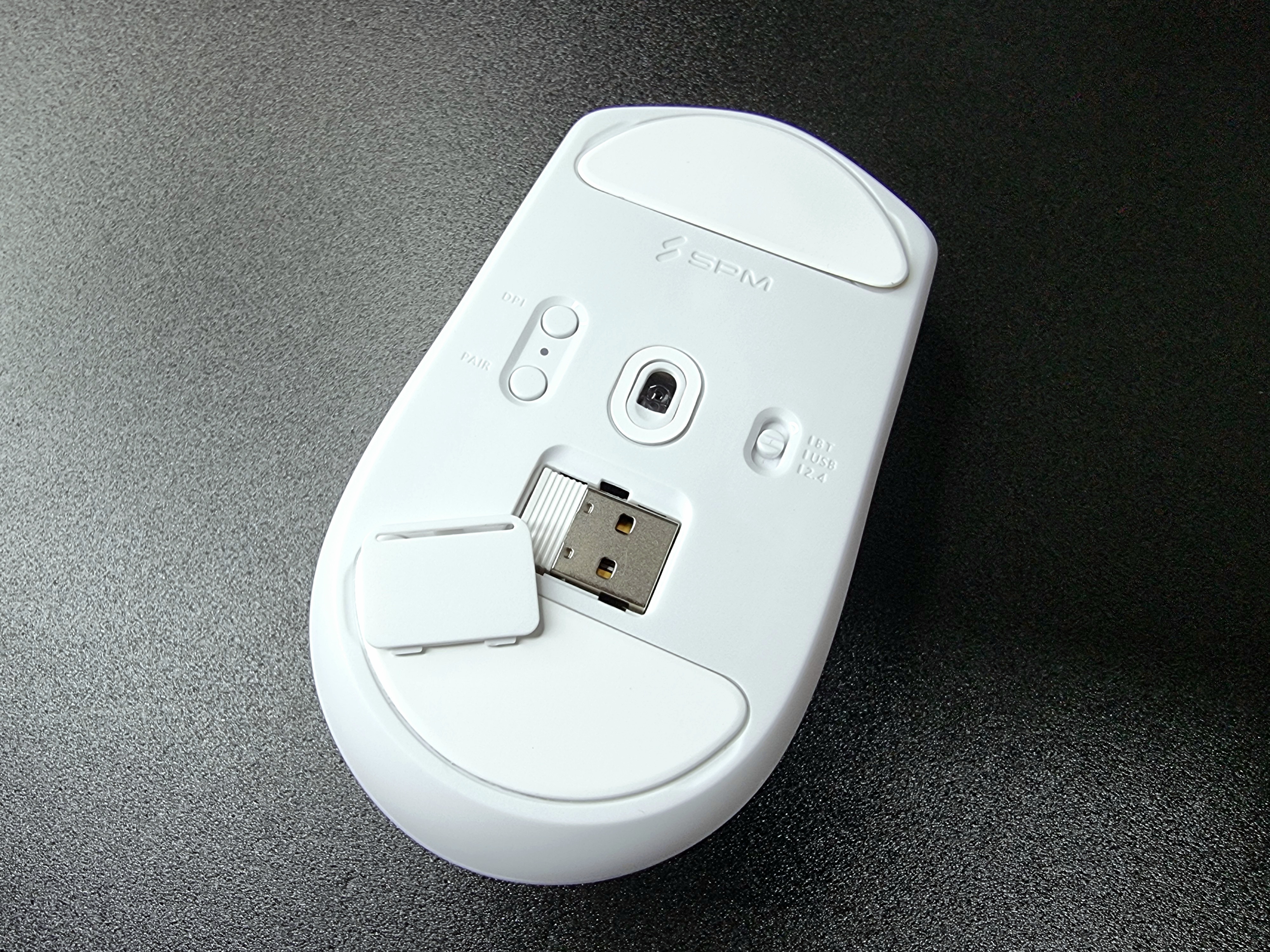 GM10A의 바닥면에는 DPI 변경 버튼, 페어링 버튼, 3가지 모드 변경 스위치, 전용 무선 동글 보관함이 있으며, 센서는 PIXART사의 최신 PAW 3395 고감도 센서로 26,000 DPI까지 지원합니다. 내부에는 플래그십 마스터 칩 노르딕 52840이 적용되어 최대 8K까지 높은 폴링레이트를 지원하며, 배터리 효율도 매우 좋습니다.