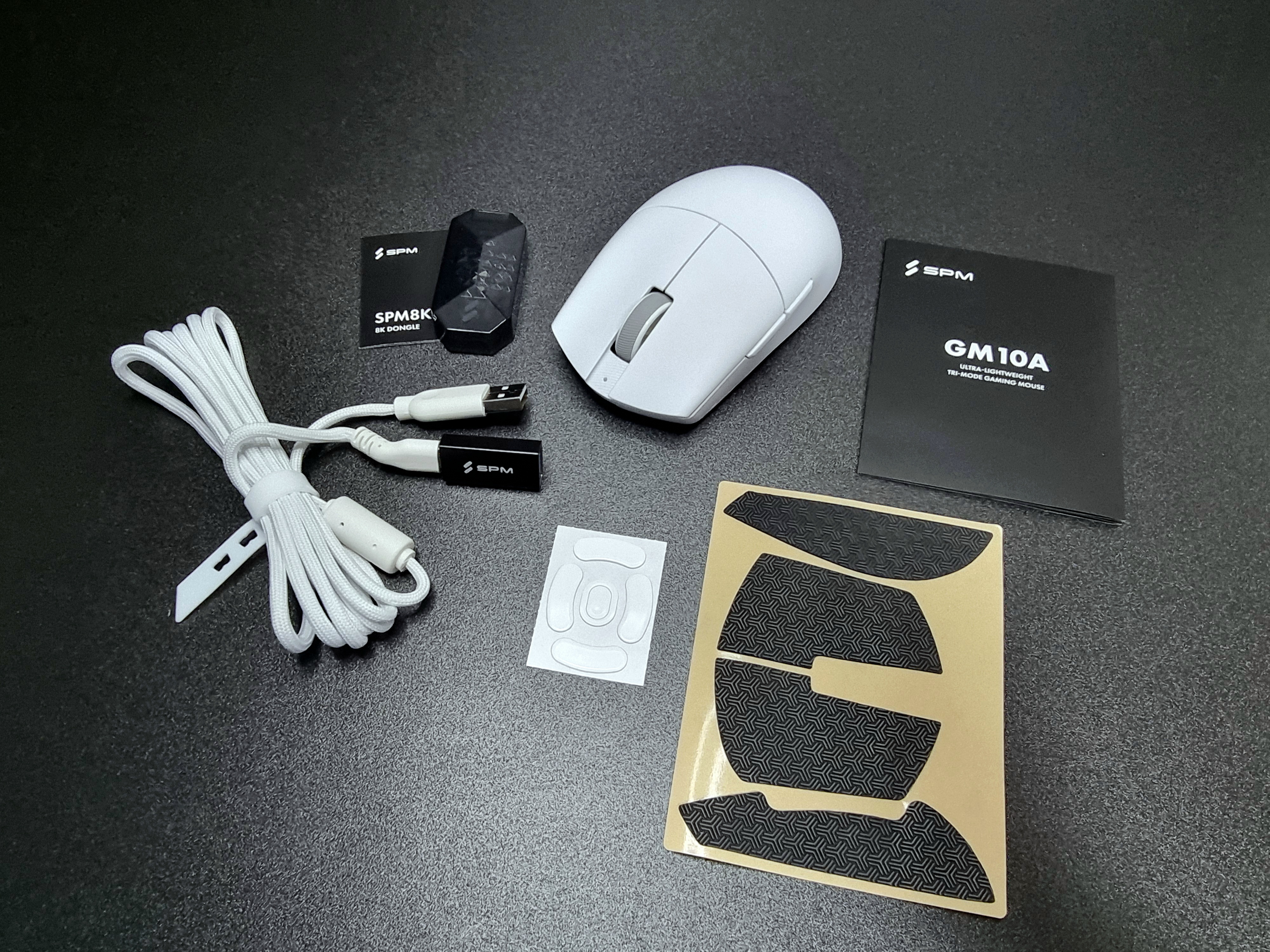 제품 구성은 GM10A 게이밍마우스, C to A 케이블, 전용 동글, 그립 테이프, 여분의 피트, 사용 설명서, 그리고 8K 전용 동글로 이루어져 있습니다.