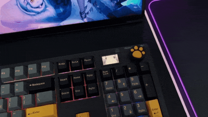 그리고 우측 상단에 화려한 색감을 표현하는 1.14인치의 TFT 컬러 디스플레이와 컨트롤 노브가 있어요. 키보드 백라이트 밝기나 패턴을 변경할 수 있고, 스피커 볼륨 조절, 애니메이션 효과까지 쉽고 빠르게 변경이 가능해요.