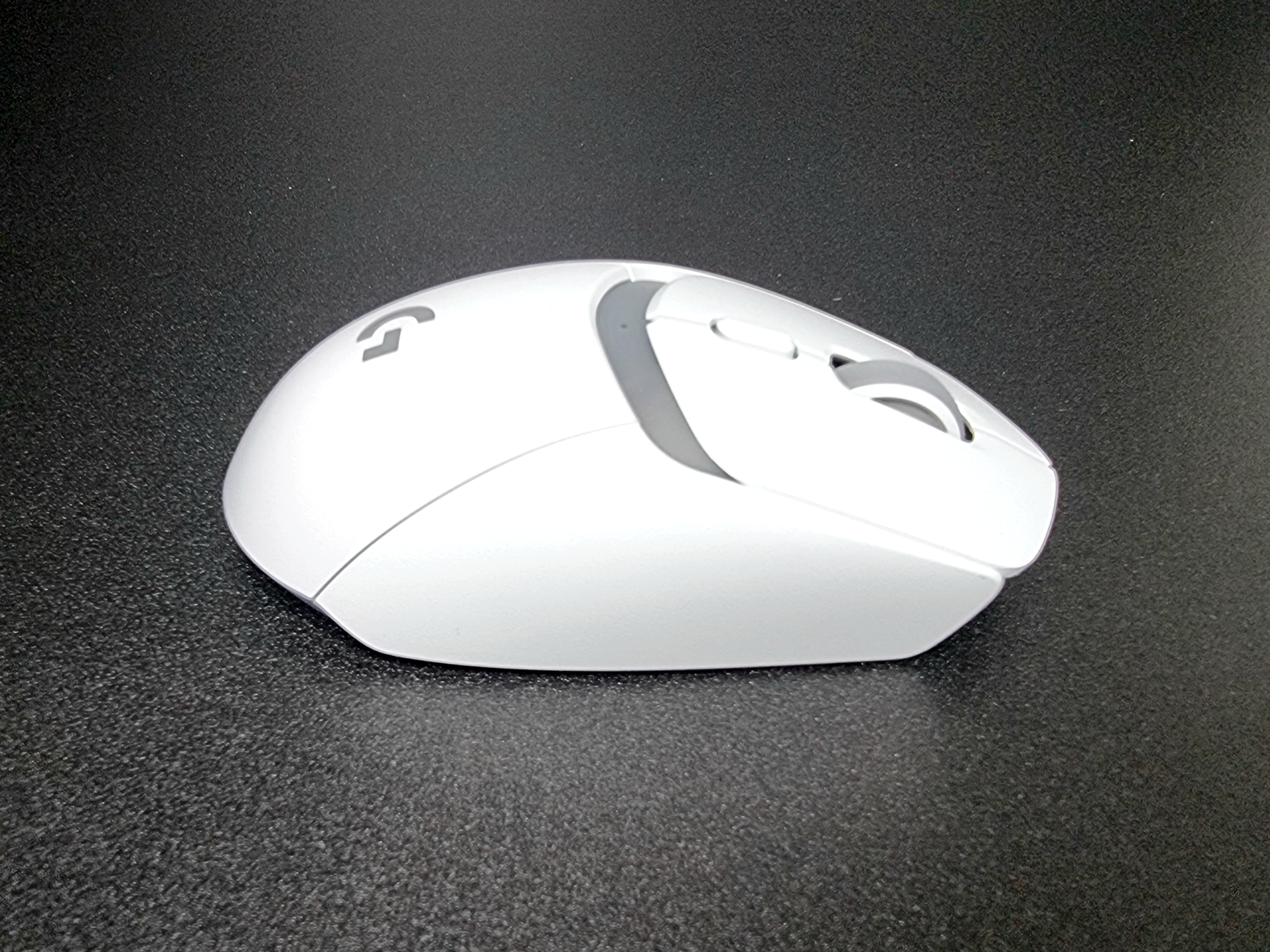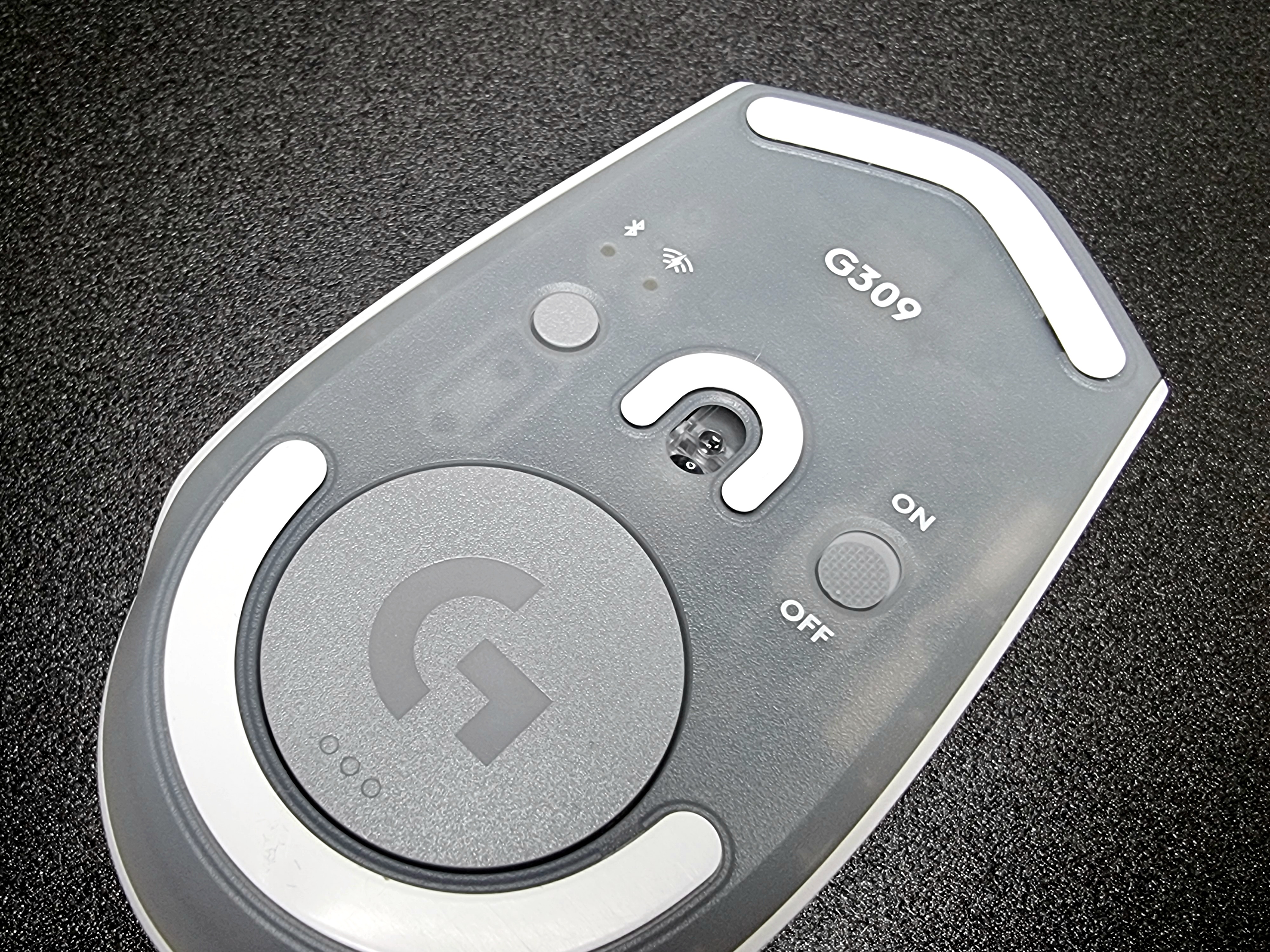 바닥면은 내부가 살짝 비치는 디자인으로 기다란 마우스 피트가 앞쪽과 뒤쪽에 자리 잡고 있고 센서 옆에는 U자 형태로 되어있어요. 연회색의 스위치 버튼들과 무선 충전단자 커버가 자연스럽게 잘 어우러져 있어 전체적으로 투박스럽지 않고 자연스러운 디자인 같아요.