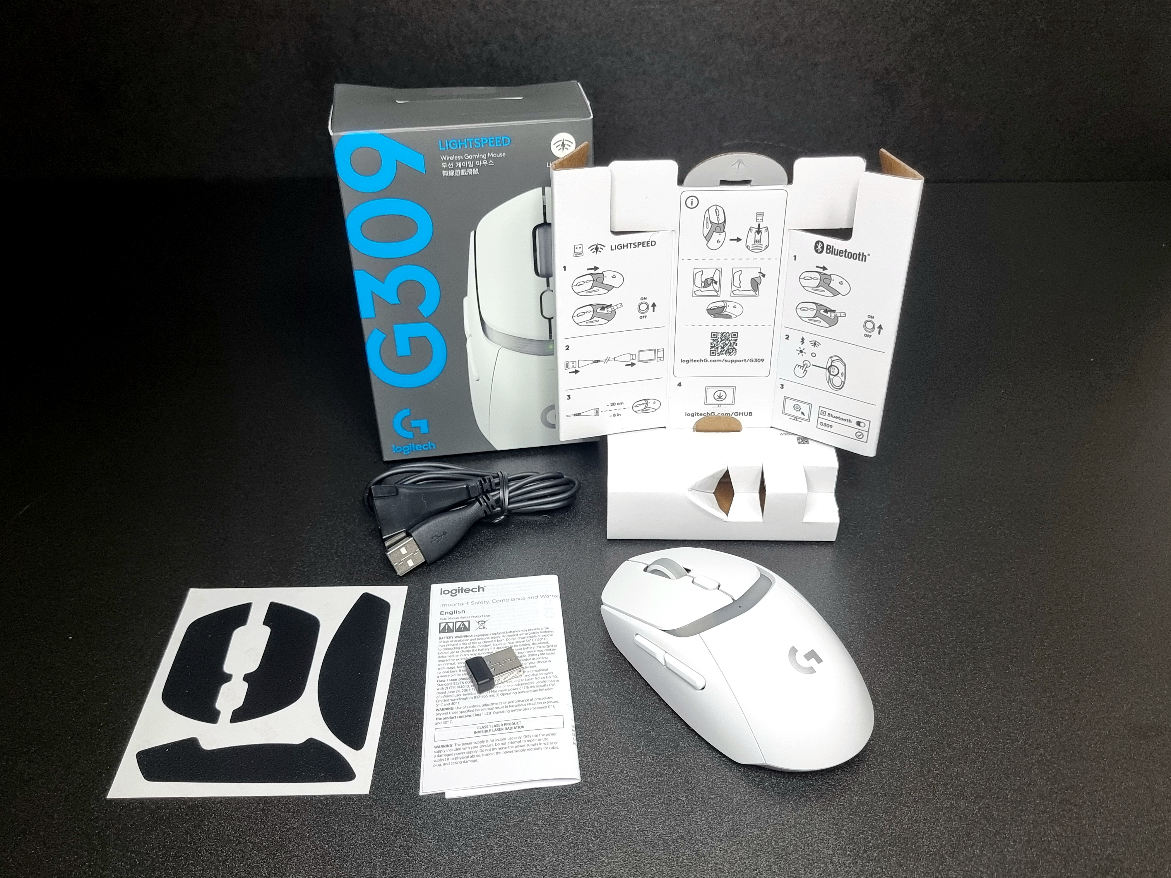 구성품으로는 G309 무선 게이밍 마우스 본품과 무선 동글, 연장 케이블, 그립 스티커, 사용설명서 등이 포함되어 있어요.