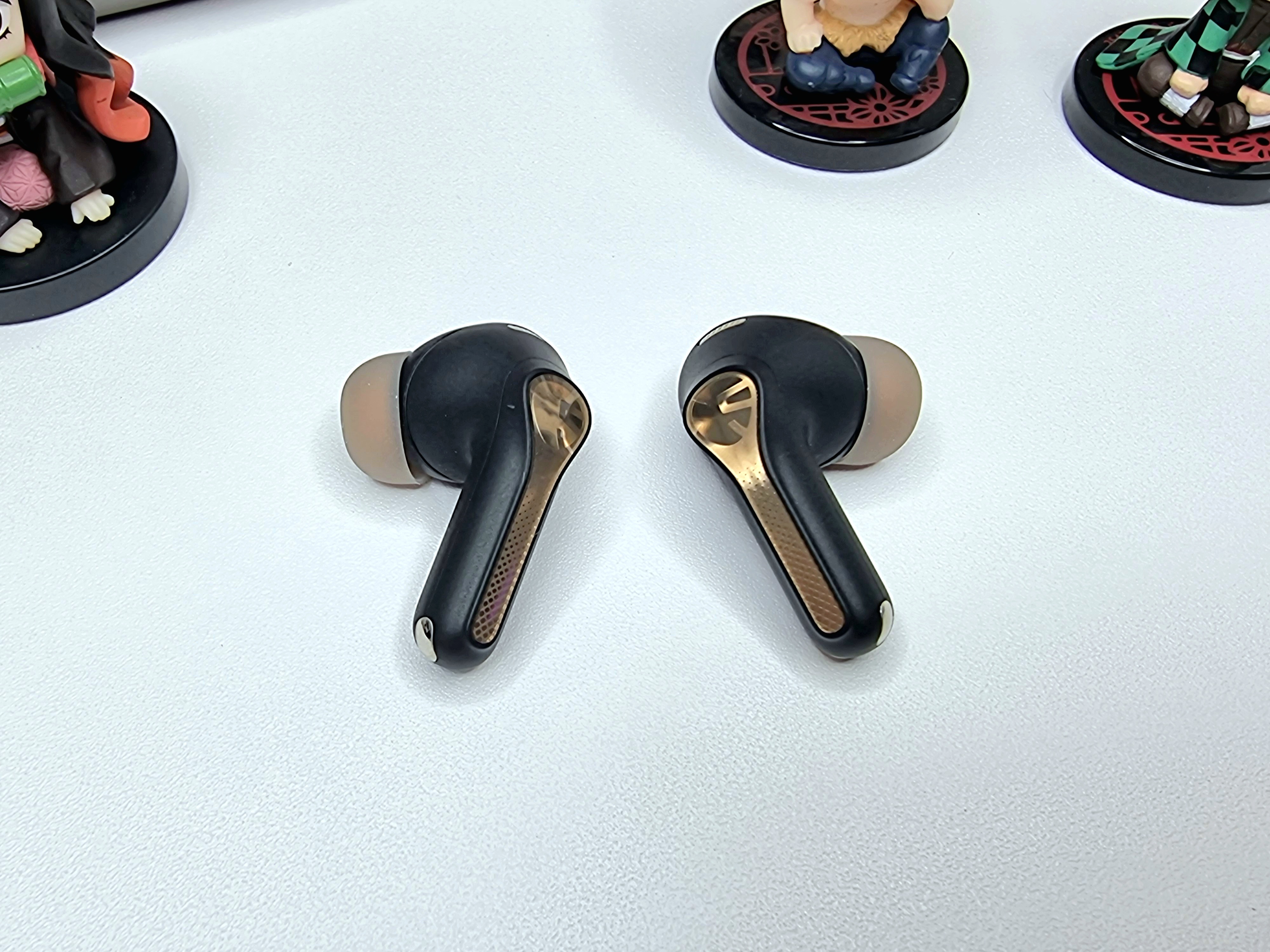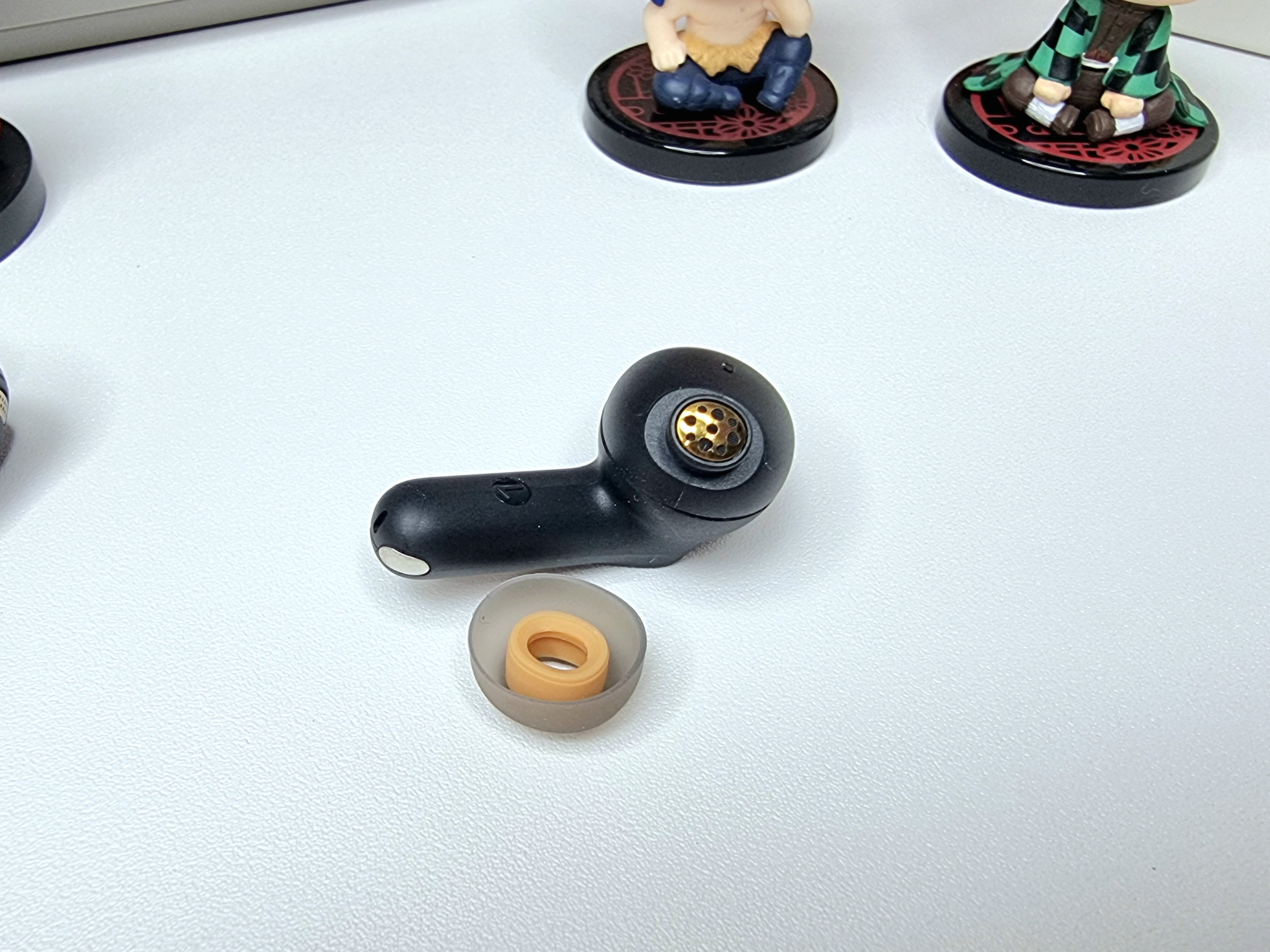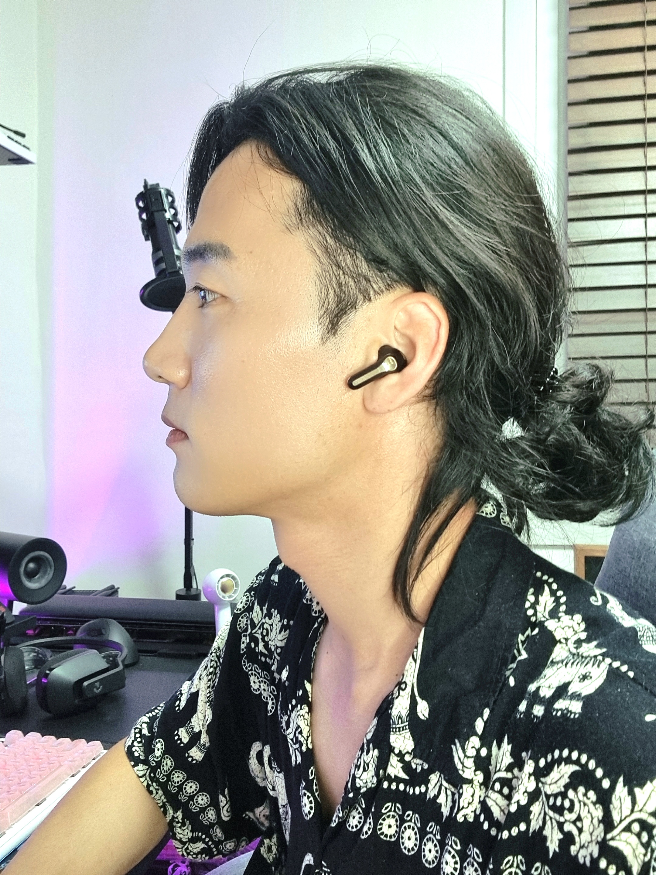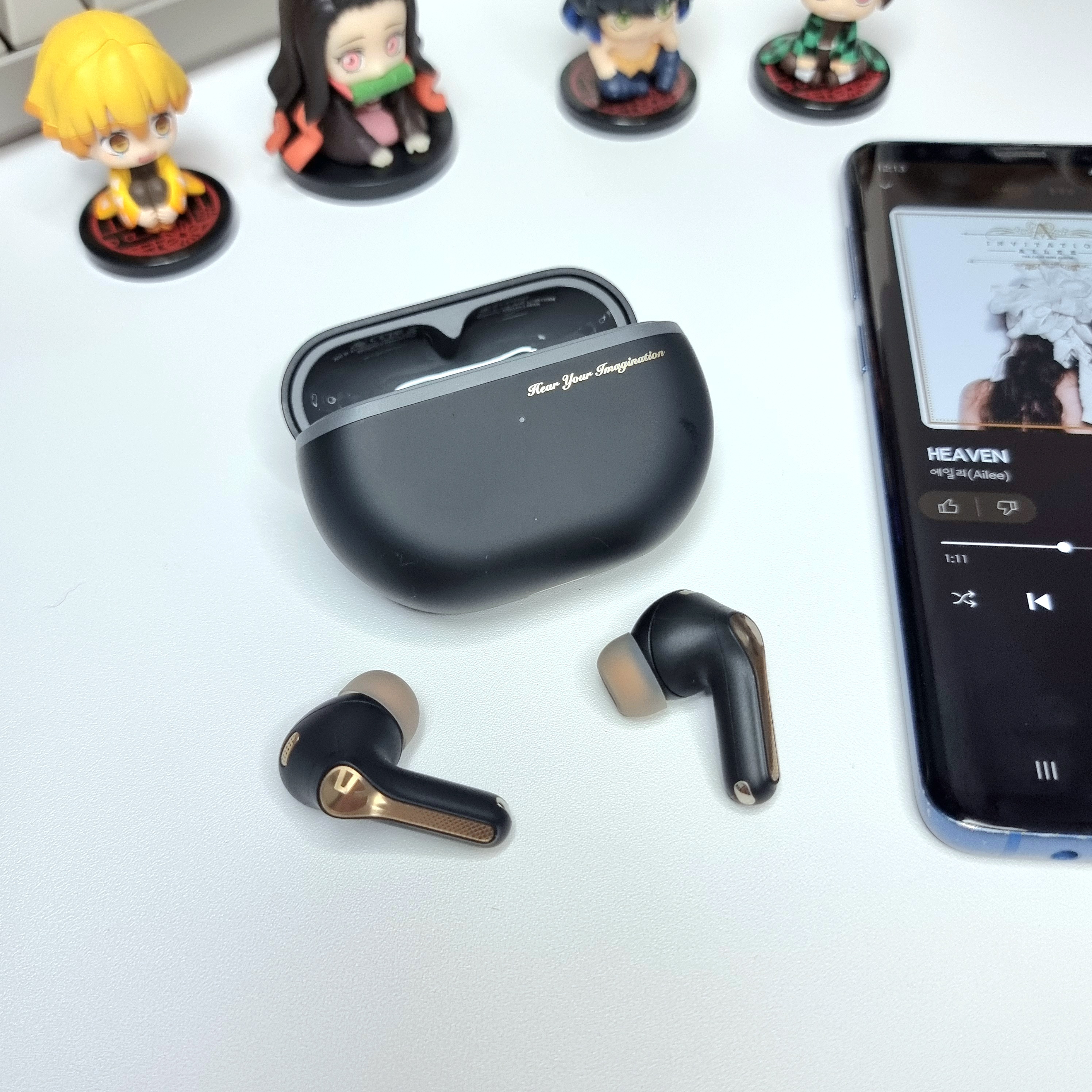 착용감은 귀에 알맞게 착용되며, 커널형이지만 불편함이 적고 가벼운 무게 덕분에 장시간 착용에도 부담이 없습니다. 블랙과 골드의 조화로운 디자인도 매우 세련된 느낌을 줍니다.