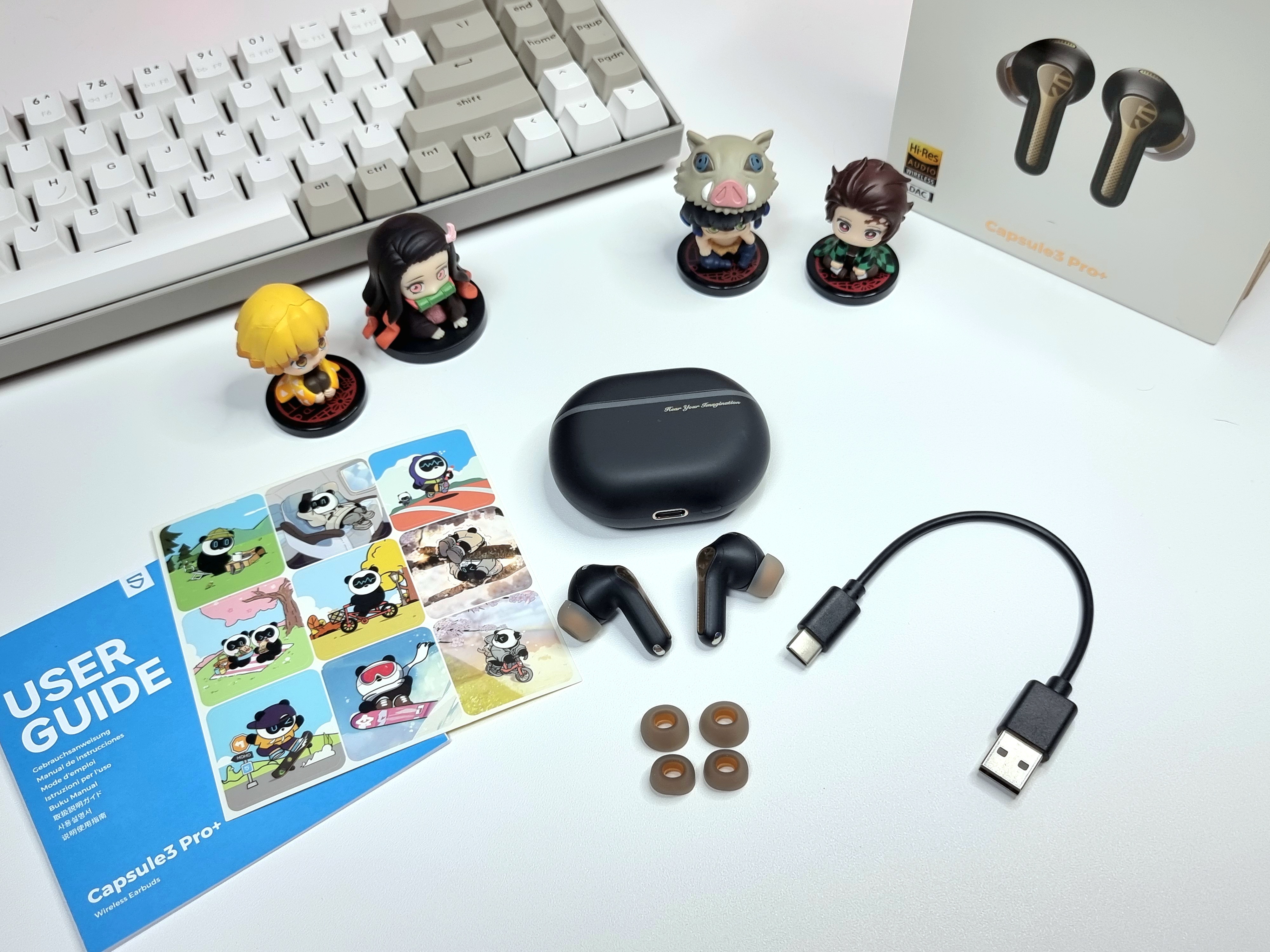 기본 구성품으로는 캡슐3프로플러스 본체, 여분의 이어팁, C 타입 충전 케이블, 사용 설명서 등이 포함되어 있습니다. 심플하면서도 필요한 모든 것이 갖추어져 있습니다.