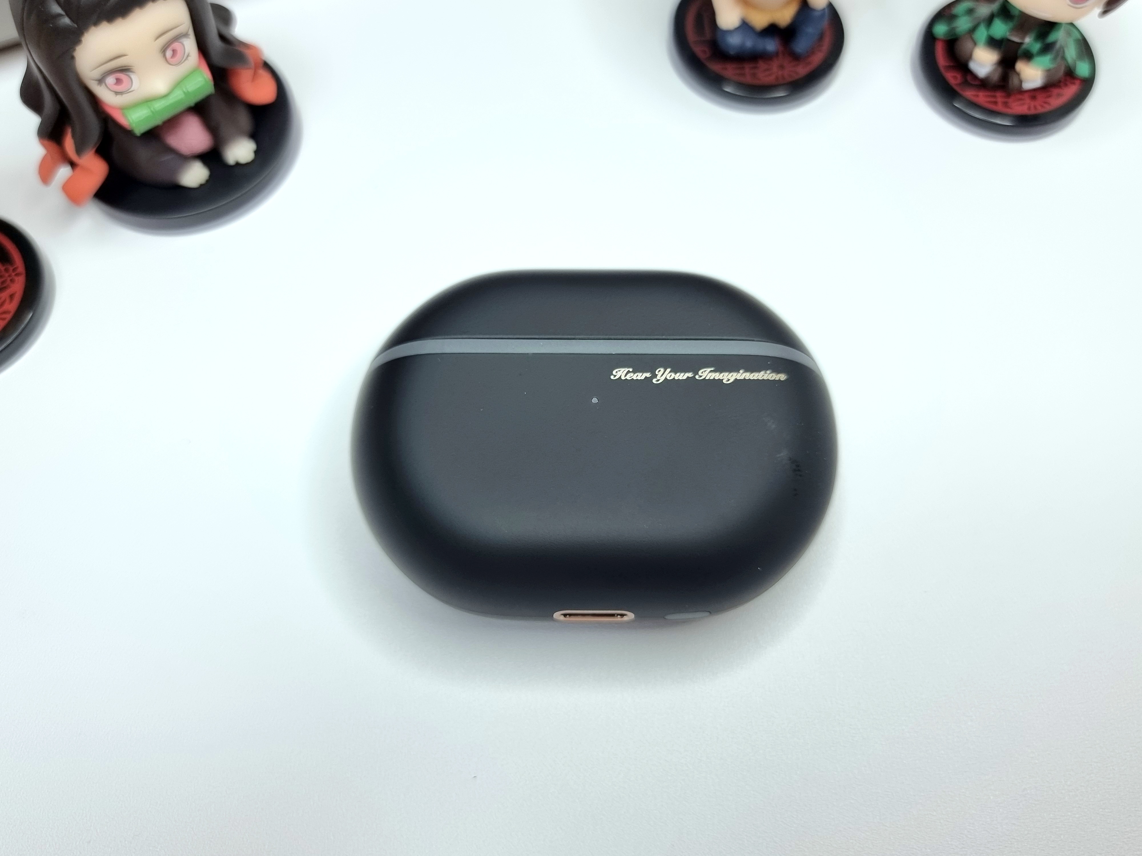 충전 케이스는 무광 블랙에 골드 포인트가 더해져 깔끔하고 세련된 디자인을 자랑합니다. C 타입 포트를 사용하며, 크기는 50.07 x 67.31 x 25.9mm로 휴대성이 뛰어납니다.