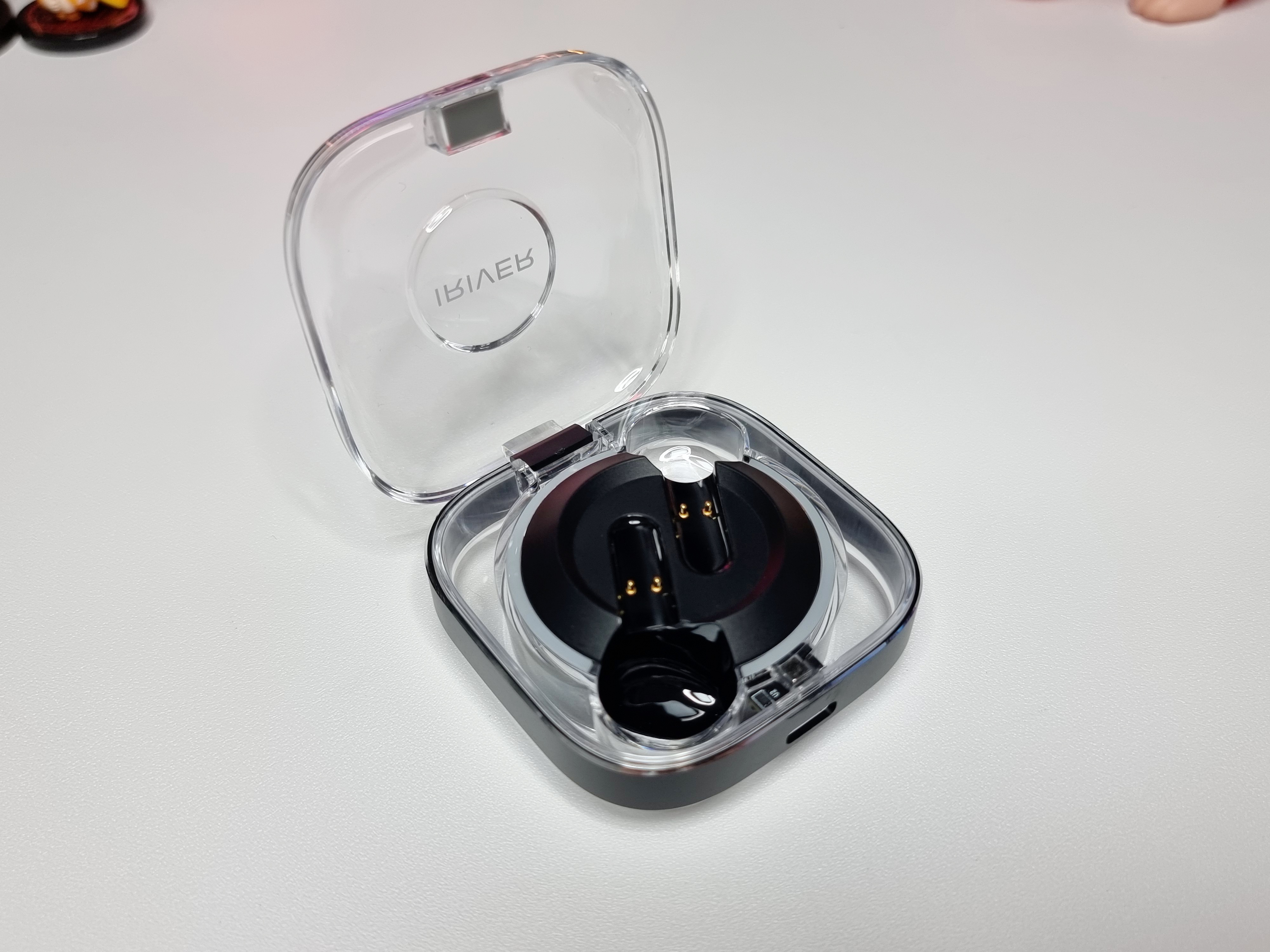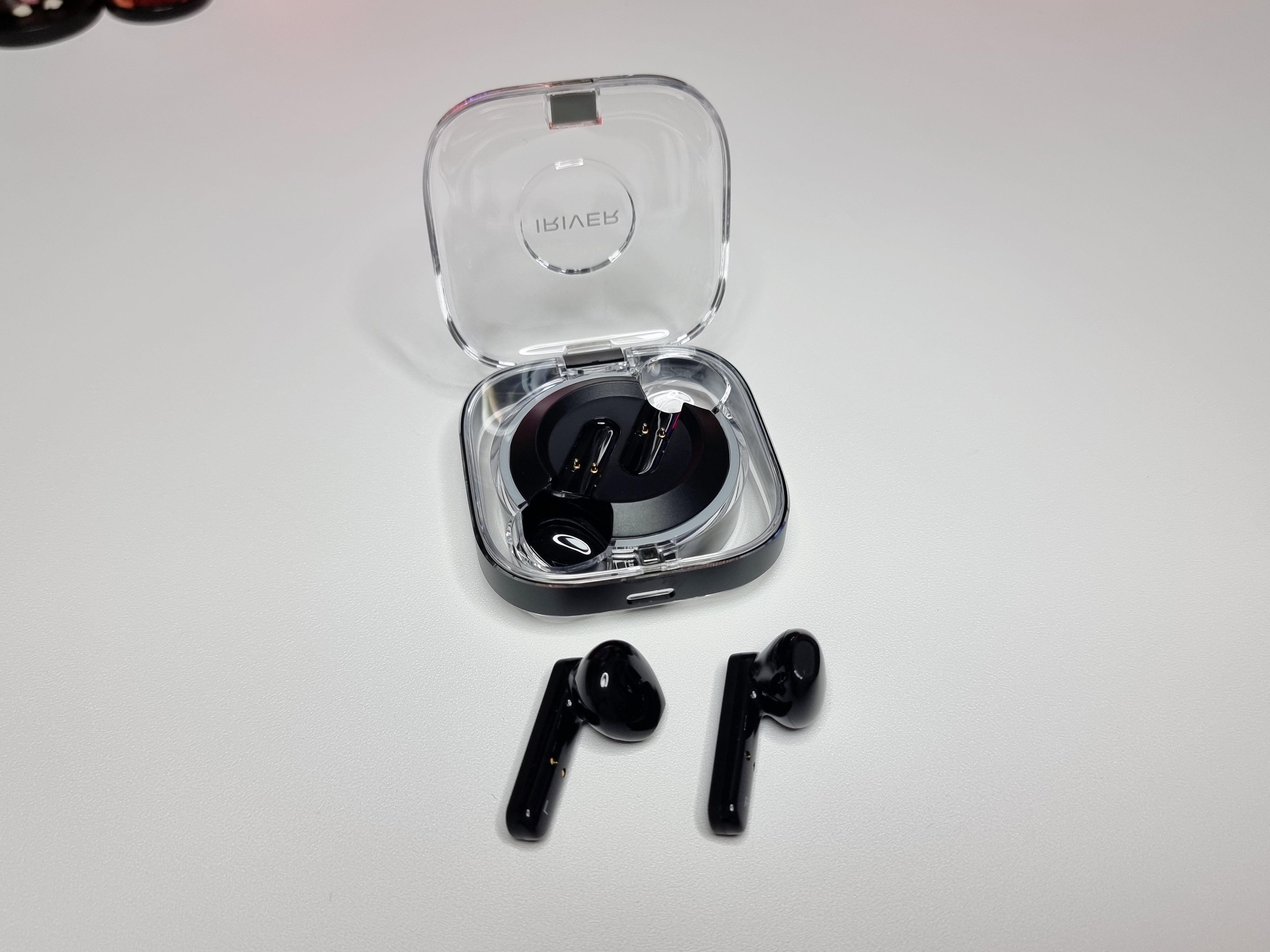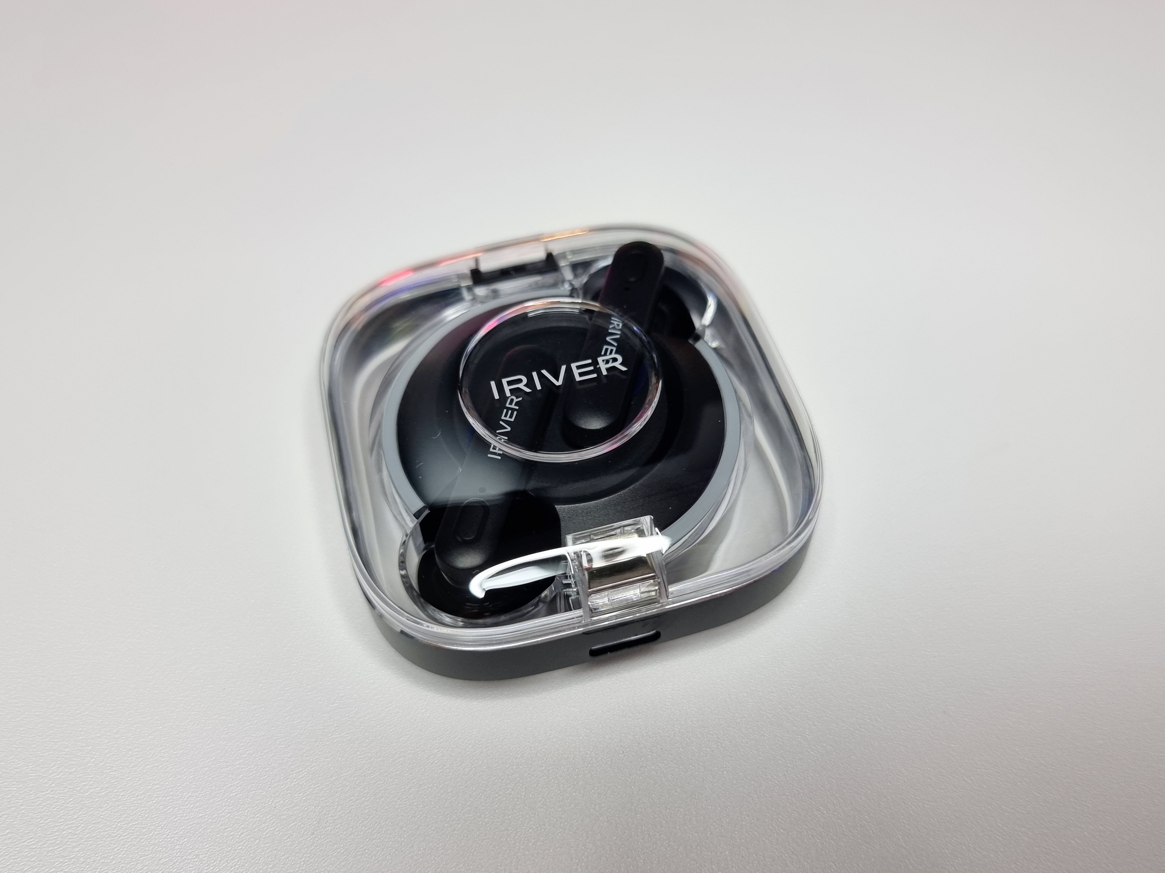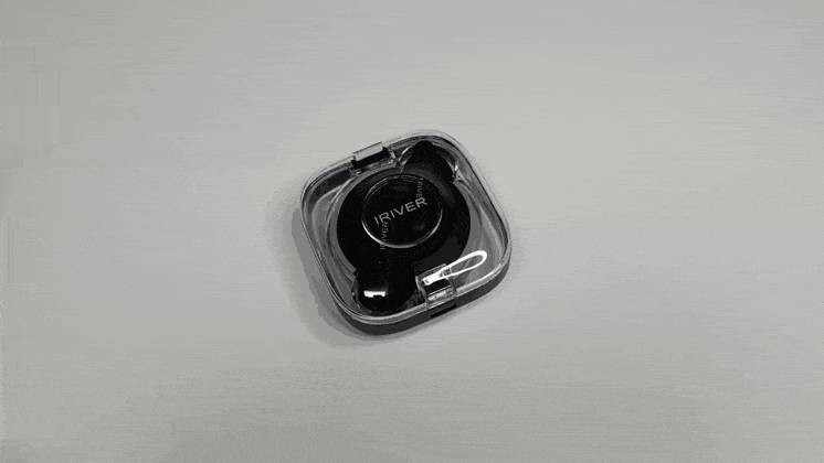 충전케이스는 시원한 느낌을 받을 수 있는 투명케이스고 이어셋은 유광 블랙 디자인입니다. 케이스와 이어셋에는 아이리버 로고가 각인되어 있어 아이리버의 감성을 느낄 수 있습니다.
