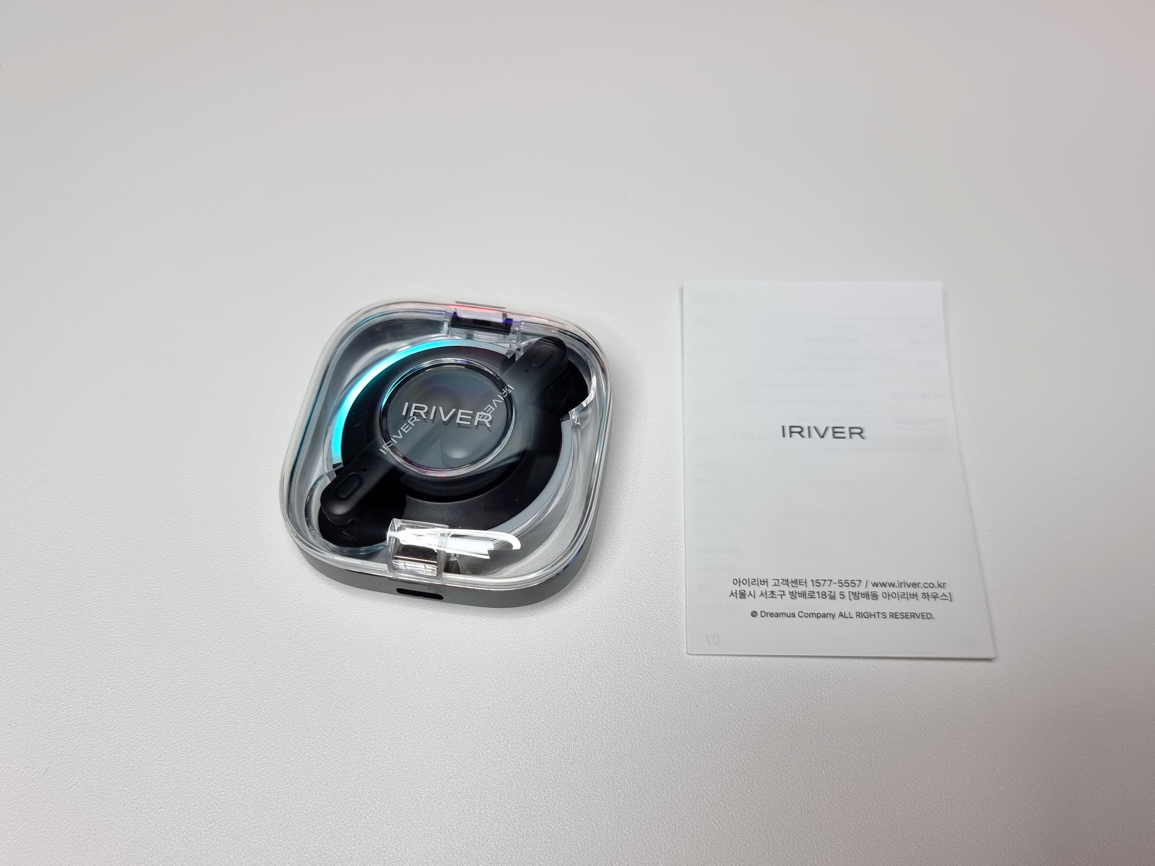 이렇게 무선이어폰 아이리버 IHT-A05 제품을 살펴보았는데요, 원형의 스카이블루 LED의 투명케이스가 정말 예쁘고 만족스러운 것 같습니다.
