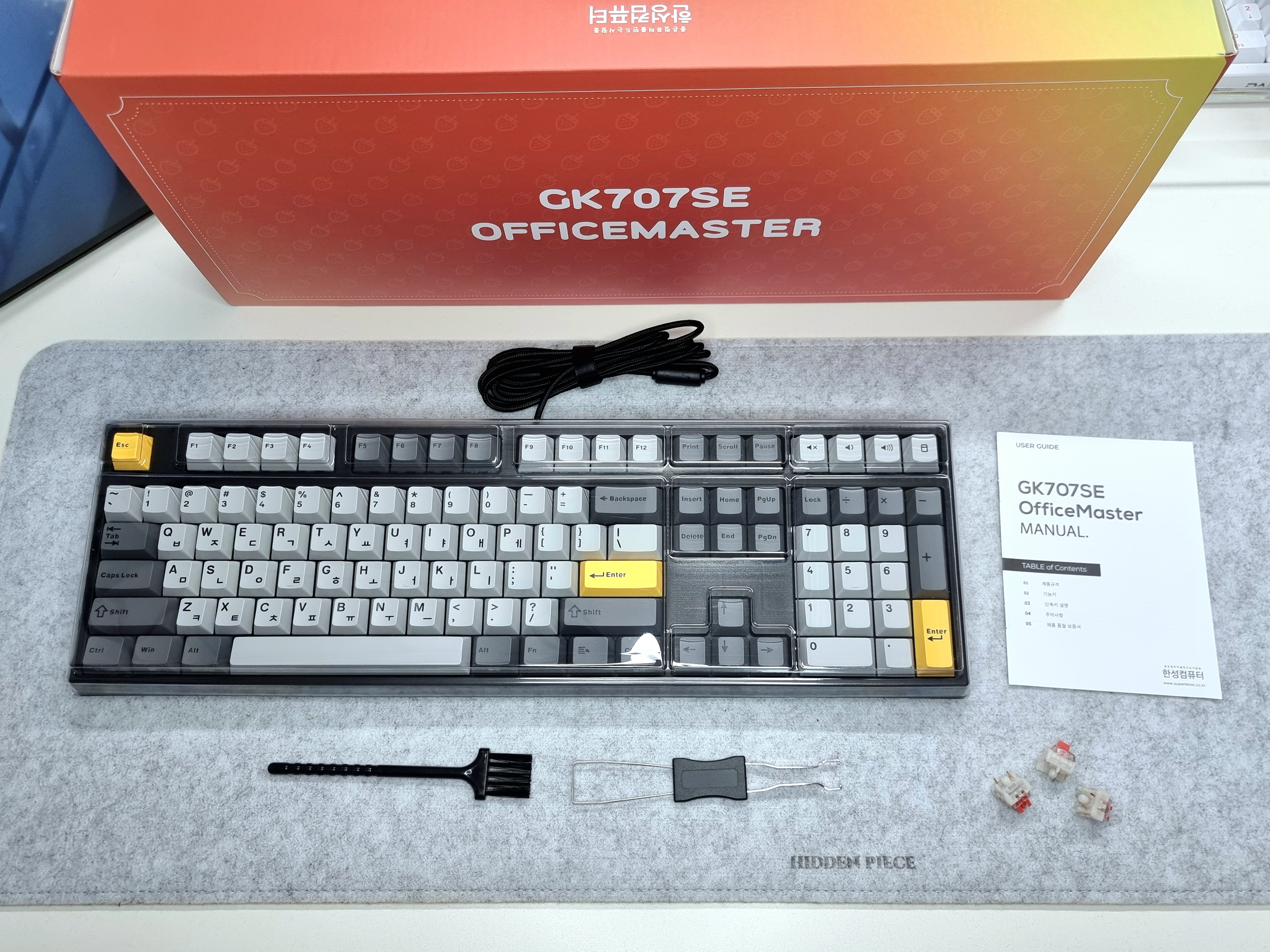 한성컴퓨터 GK707SE의 기본 구성품으로는 키보드 본체, 키보드 루프, 스위치 및 키캡 리무버, 브러쉬, 여분의 저소음 적축 스위치 3개, 그리고 간단한 사용 설명서가 포함되어 있습니다.