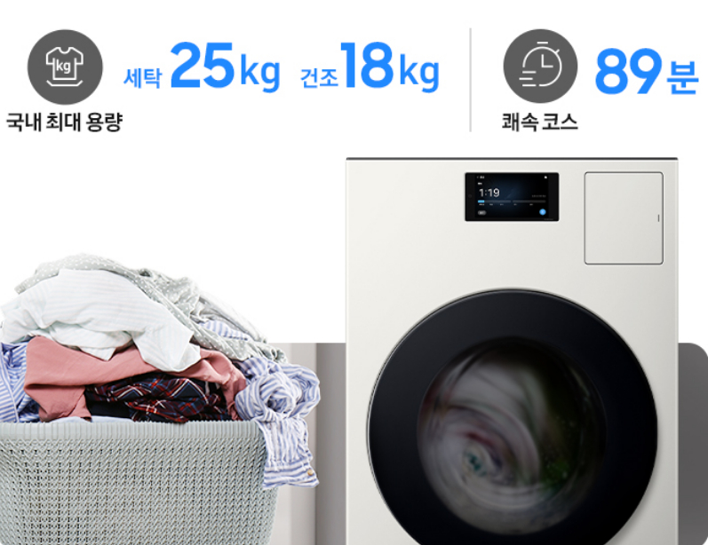 올인원세탁기는 말 그대로 세탁기와 건조기를 하나의 기기에 통합한 형태입니다. 별도 건조기를 설치할 공간이 부족하거나, 빨래를 옮기는 번거로움을 줄이고 싶은 가정에서 특히 선호됩니다. 삼성 WD90F25CHY 모델은 세탁 25kg, 건조 18kg의 대용량을 지원해 이불, 패딩 같은 부피 있는 옷도 거뜬히 처리할 수 있습니다.