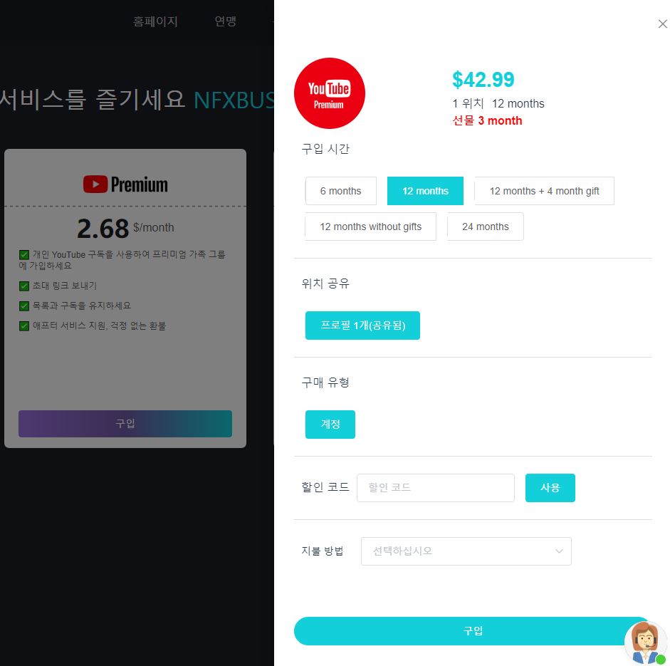 하지만 아래 NFXBUS 사이트를 이용하면 유튜브 프리미엄 할인된 가격 15개월(12개월 + 3개월 보너스) $42.99 금액으로 사용이 가능하고 할인코드 10%까지 적용하면 추가 할인이 가능합니다.