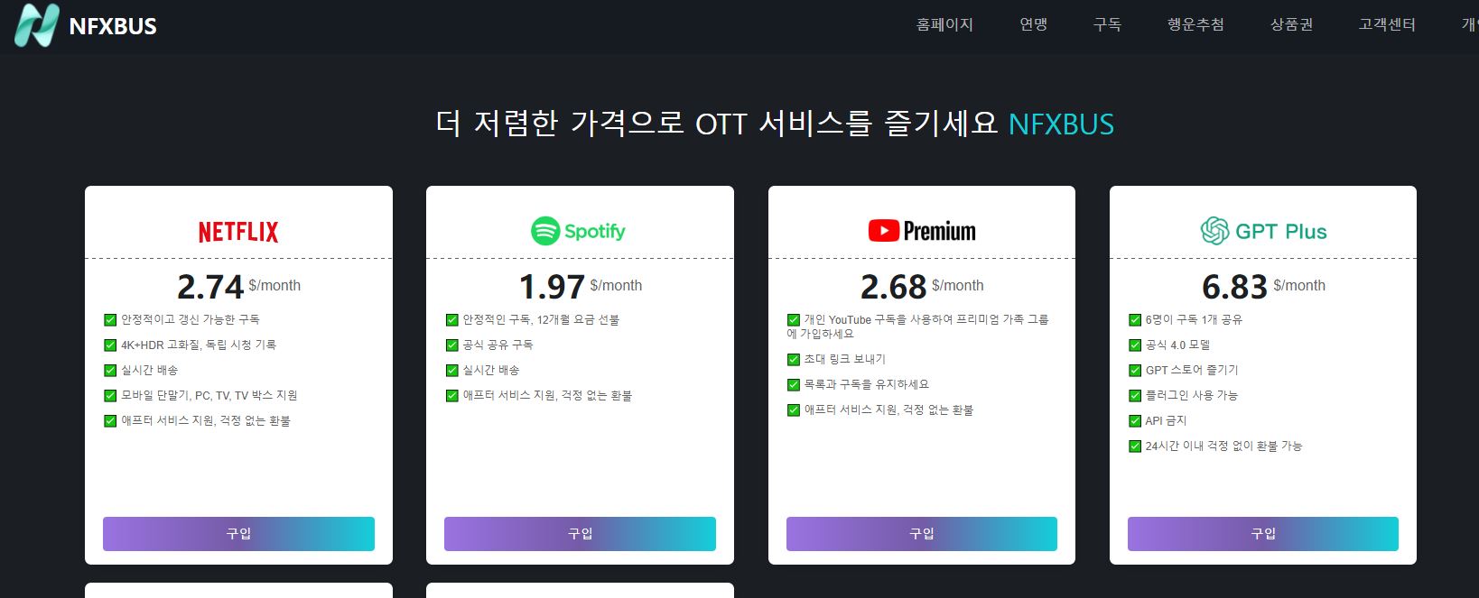 NFXBUS 사이트를 이용하면 월 3,000원 대로 유튜브 프리미엄이 가용 가능합니다. 많은 분들이 현재 사용중에 있고 24시간 고객 센터도 운영하고 있어 편리하게 사용이 가능합니다.