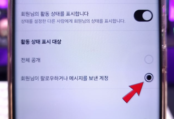 - ‘회원님이 팔로우하거나 메시지를 보낸 계정만 보기’로 설정 시 → 지인, 친한 친구 등 일부에게만 내 활동 표시