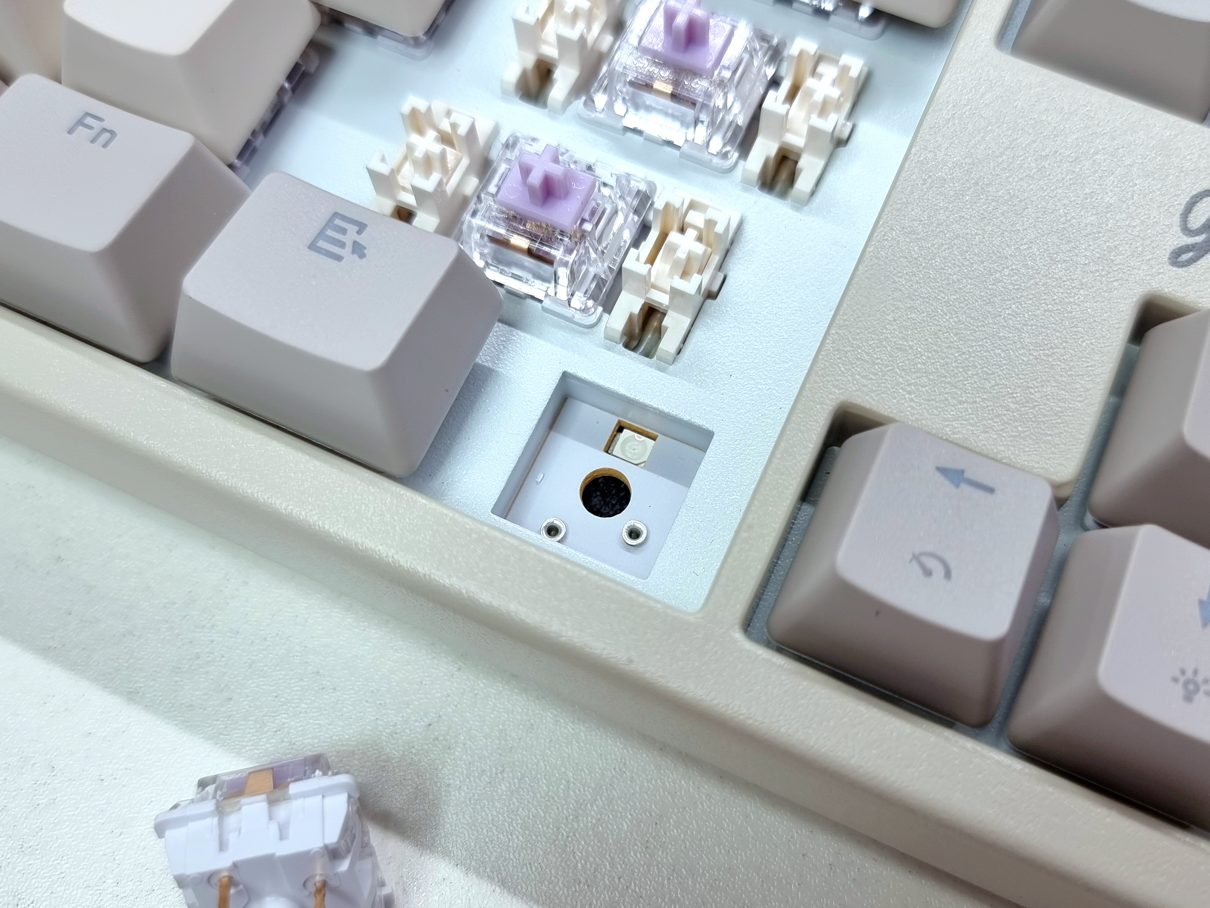 스위치는 클라우드 퍼플 저소음 스위치로 공장 풀 윤활 처리가 되어 있어 부드럽고 조용한 타건감을 제공합니다. 5000만 회 이상의 수명을 자랑하며, 타건 시 손목에 부담이 적고 피로감을 줄여줍니다. 3핀 스위치만 지원되니 5핀 스위치를 사용하려는 분들은 주의가 필요합니다.