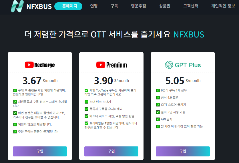 NFXBUS는 유튜브 프리미엄, 넷플릭스, 디즈니 플러스 등 다양한 구독형 서비스를 저렴하게 제공하는 플랫폼입니다. 저도 GPT-5 구독을 여기서 결제해 사용 중인데, 절차가 단순하고 결제 수단이 다양해 편리합니다.