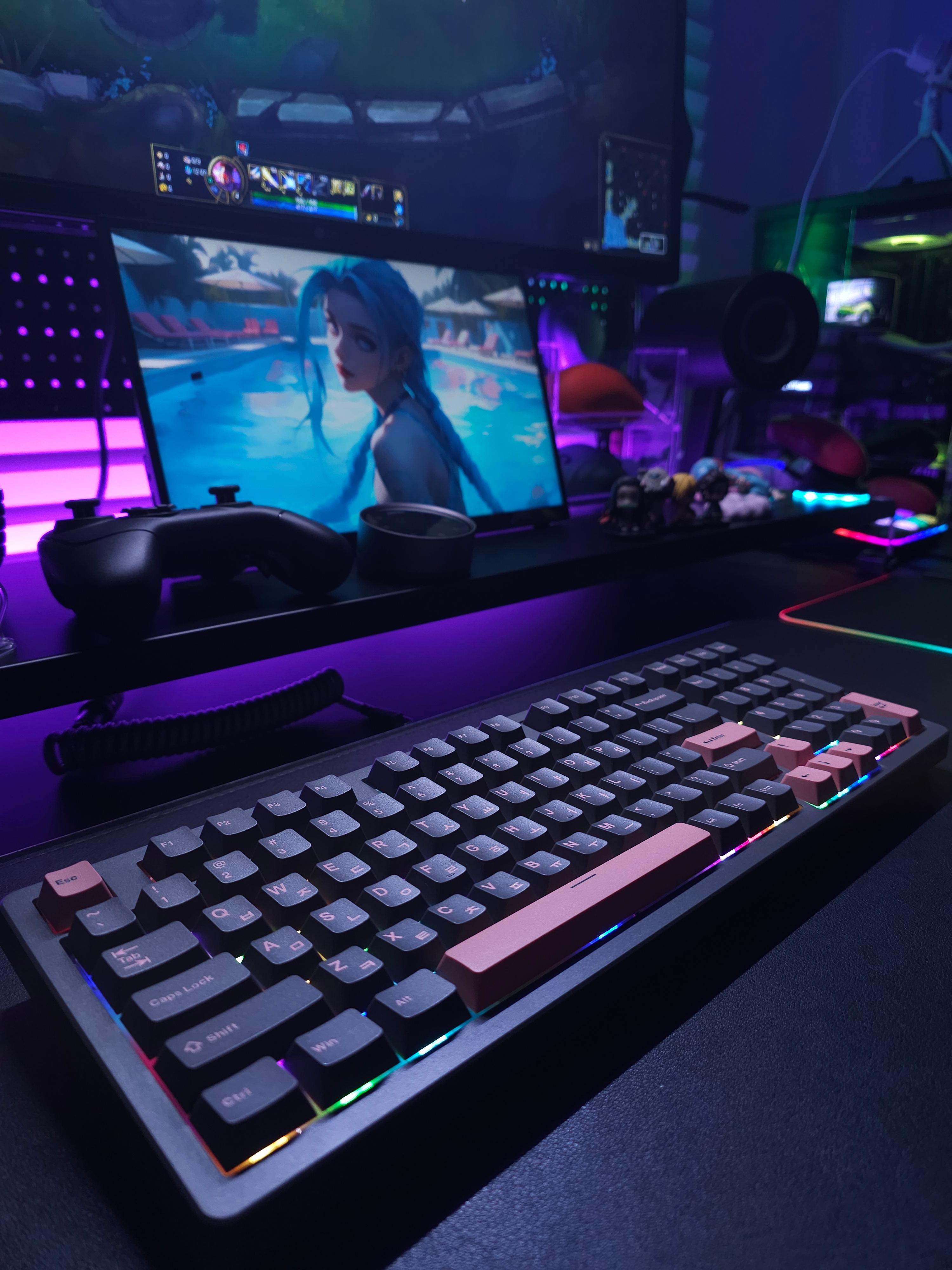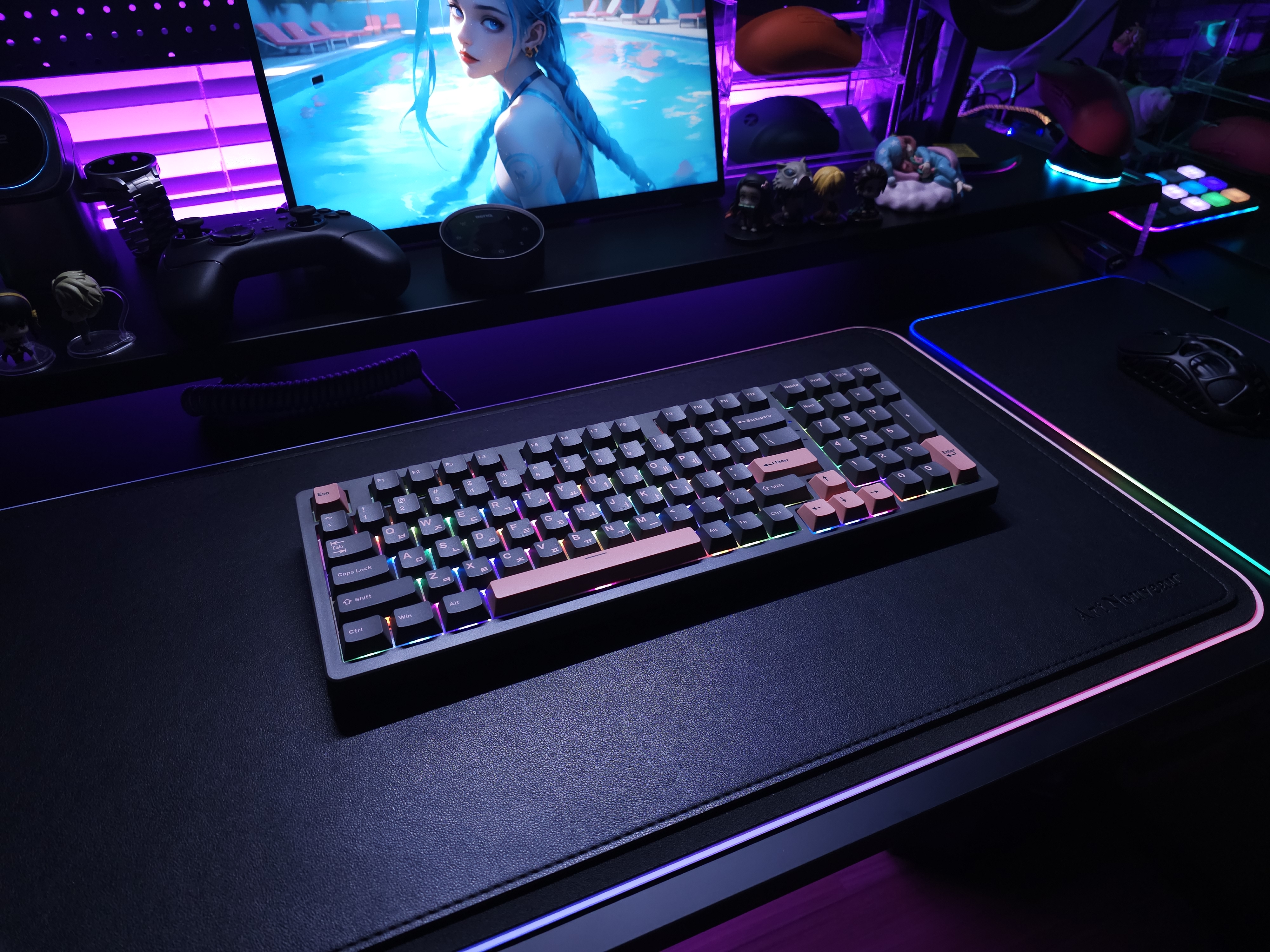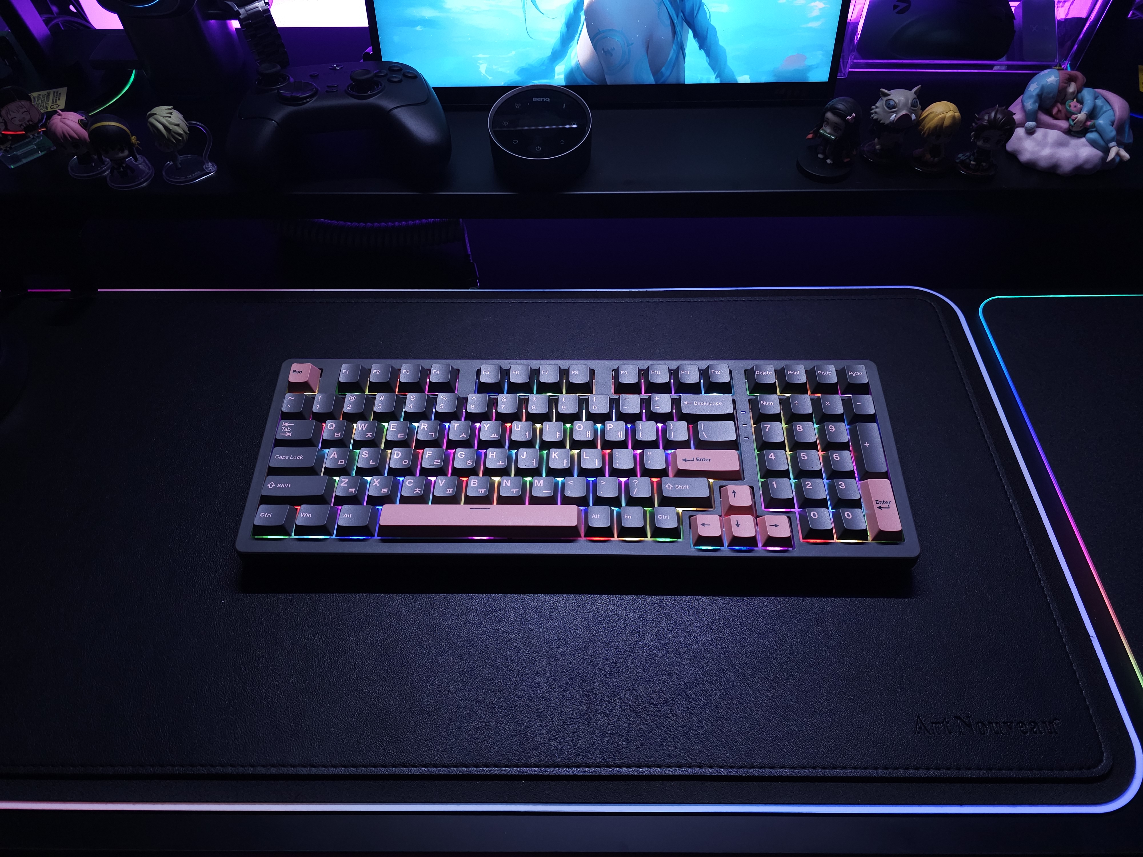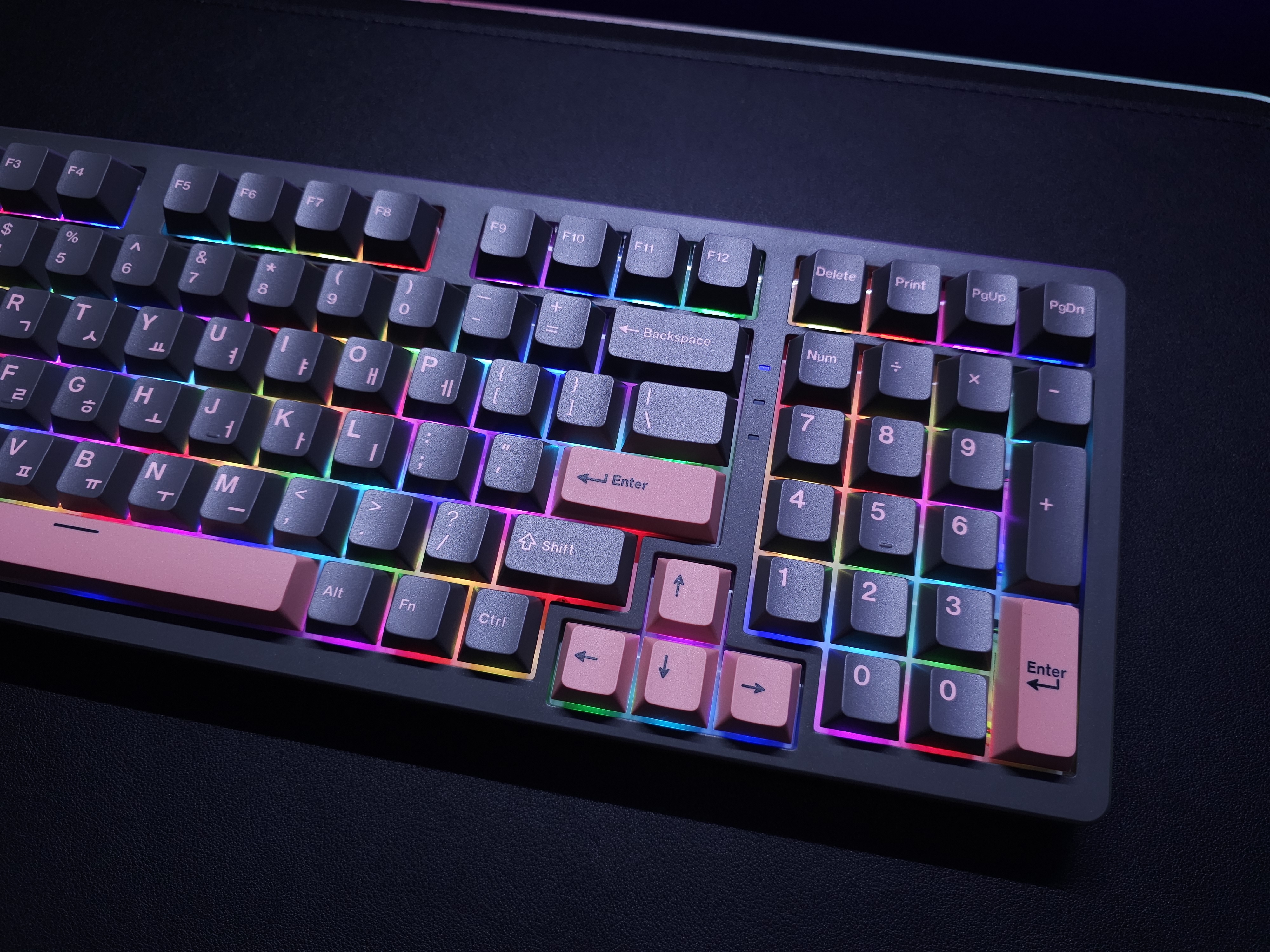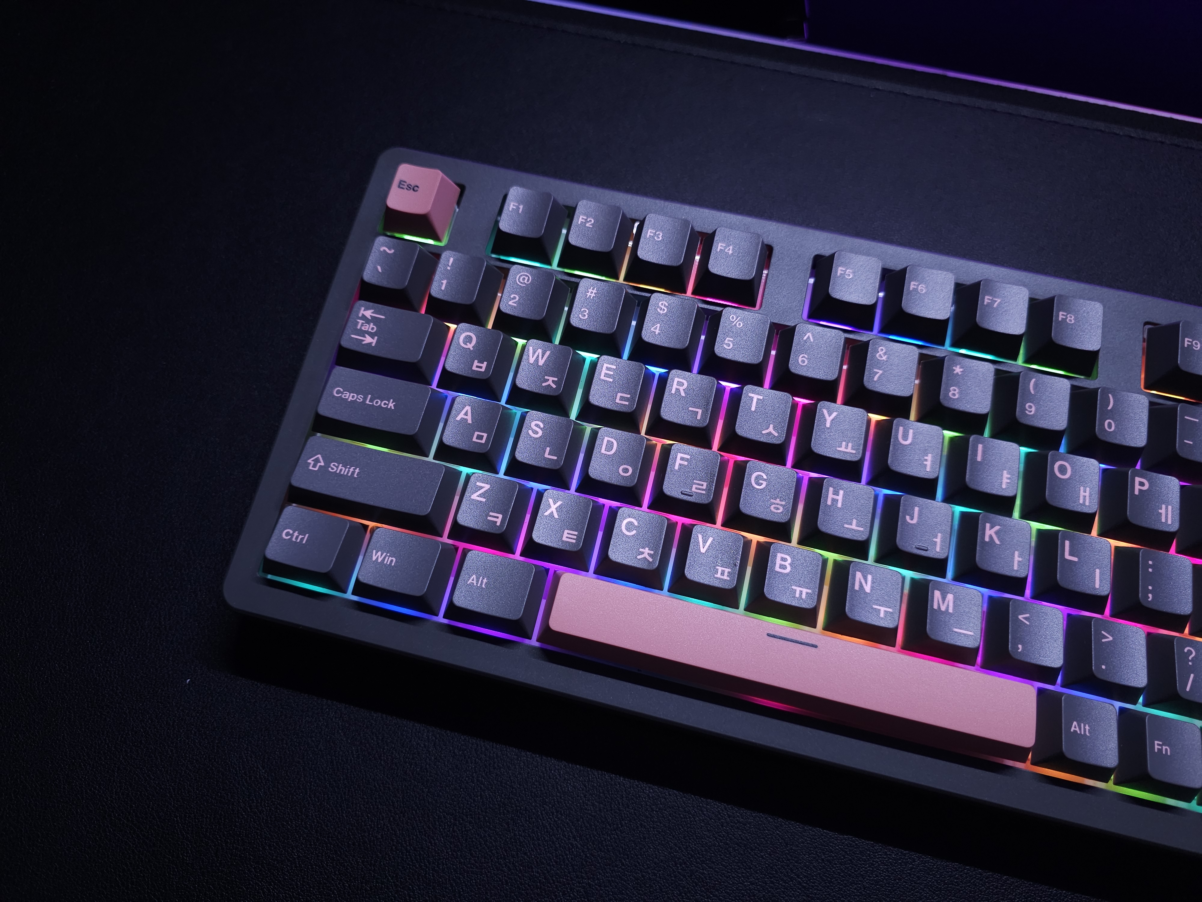 톤 다운된 차콜 그레이 바디에 핑크 포인트 키캡이 어우러진 투톤 디자인이 돋보입니다.