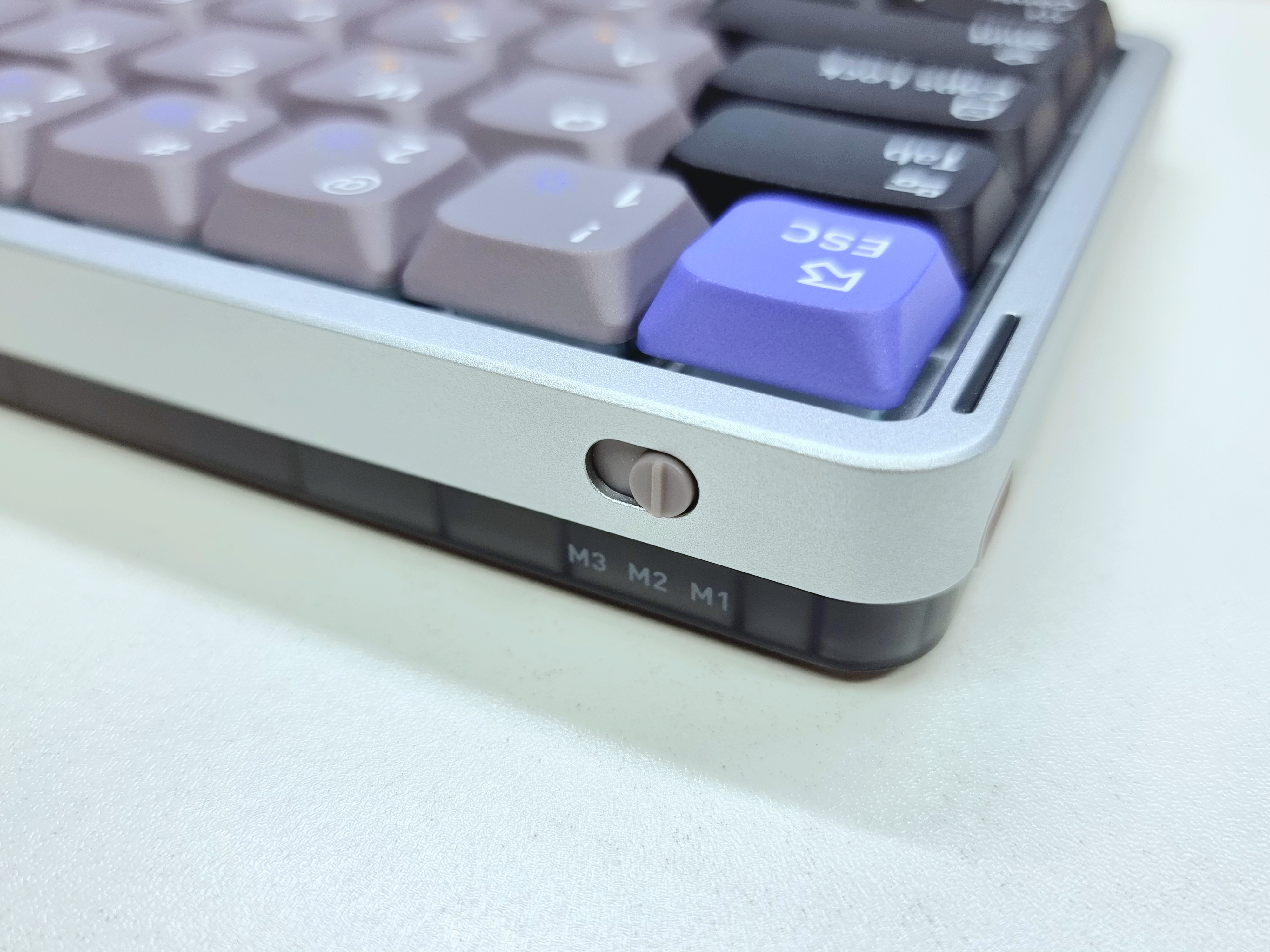 측면에서는 일반 키보드보다 훨씬 얇은 두께를 확인할 수 있으며, 로우 프로파일 스위치가 적용되어 키캡 높이가 매우 낮습니다. 상판은 알루미늄 재질로 고급스럽게 제작되었고, 하판은 불투명 플라스틱으로 되어 있습니다.