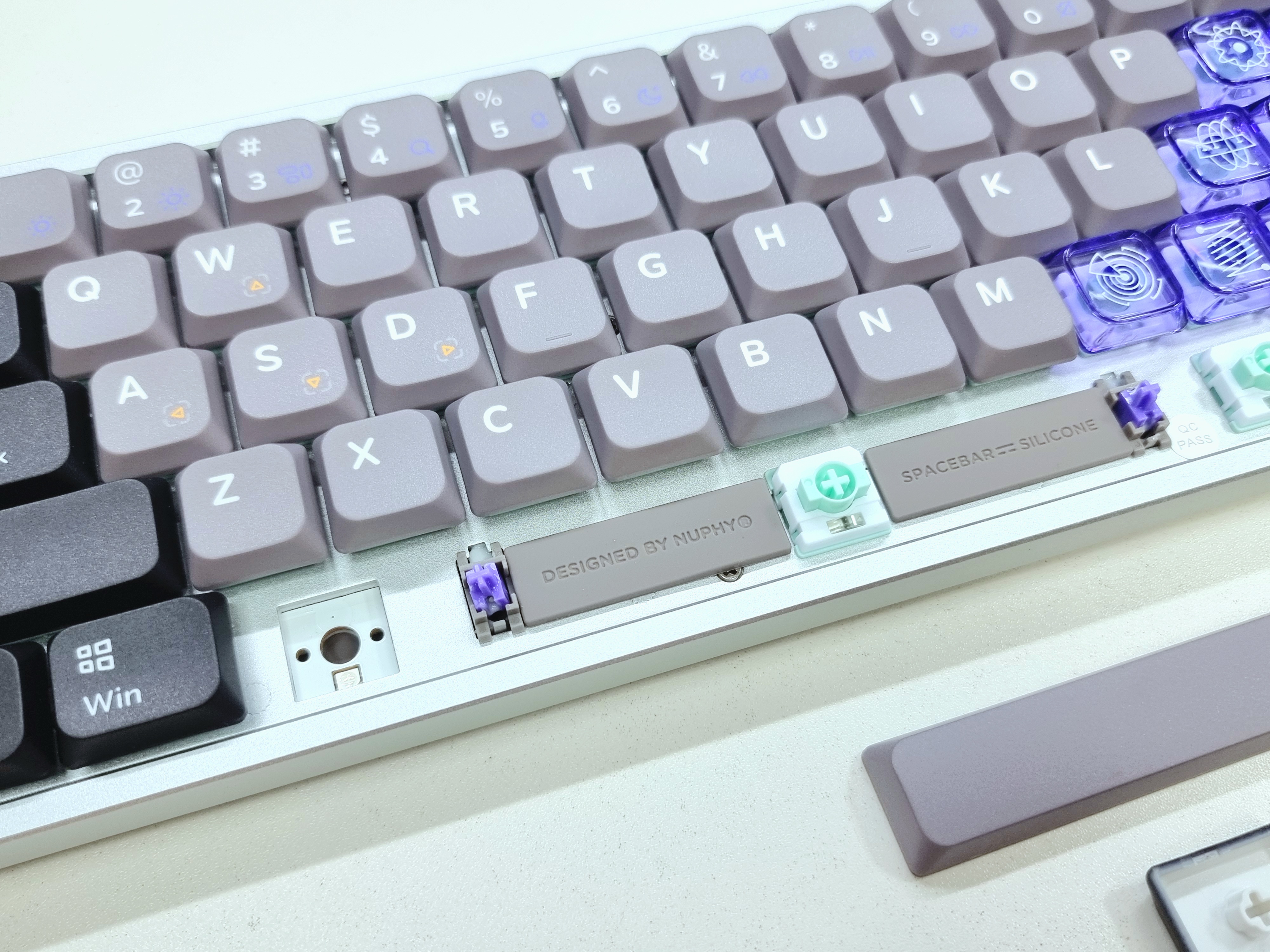 내부에는 알루미늄 보강판이 채택되어 있으며, 스위치 핫스왑은 3핀 스위치와만 호환됩니다. 백라이트 LED는 키보드 하단에 위치하며, 공장 윤활 처리가 되어 있어 스테빌라이저가 부드럽게 동작합니다.