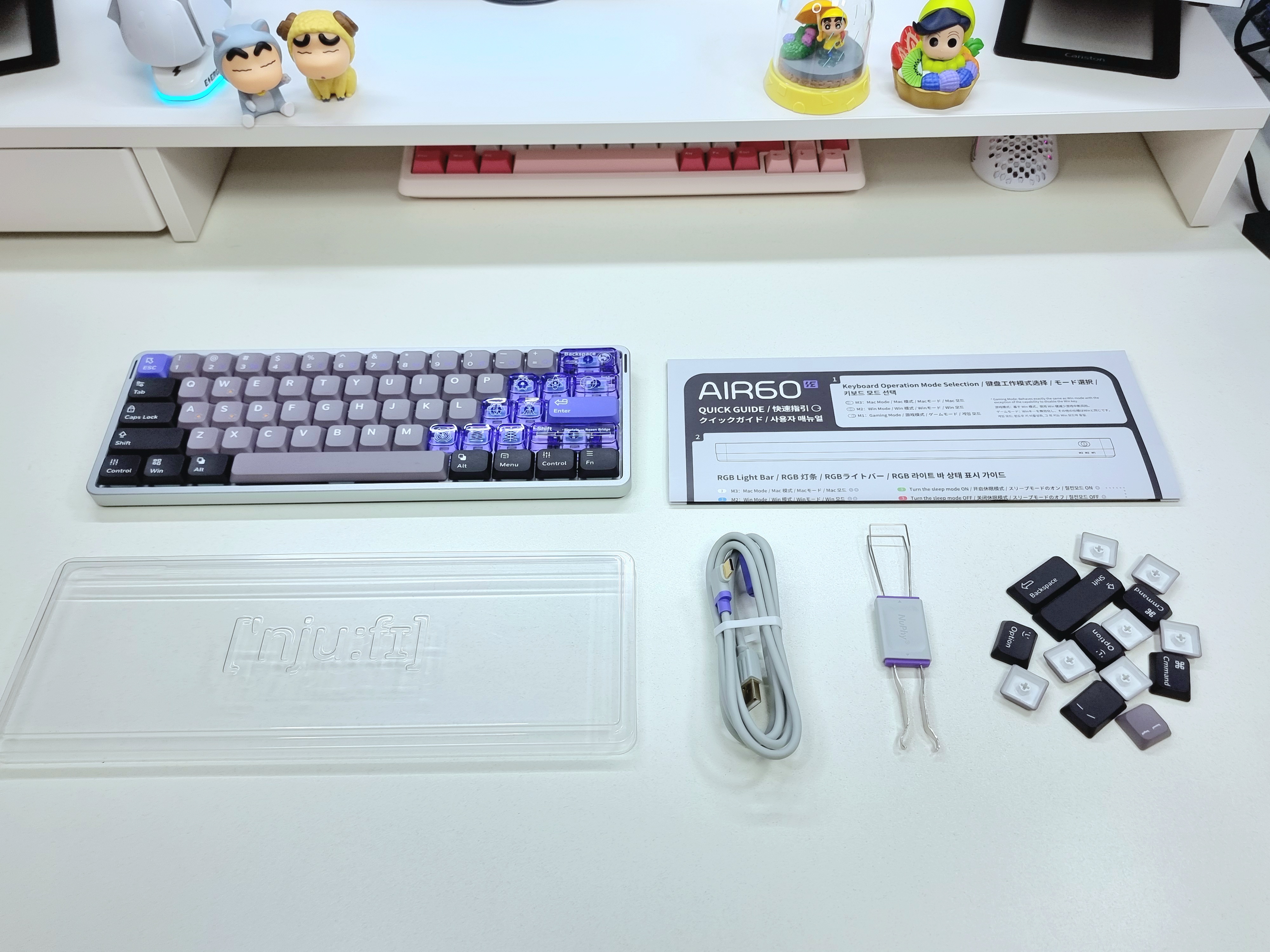 구성품으로는 AIR60 HE 본체, 키보드 루프, 퀵 가이드, C타입 케이블, 키캡/스위치 풀러, 여분의 키캡 등이 포함되어 있습니다.
