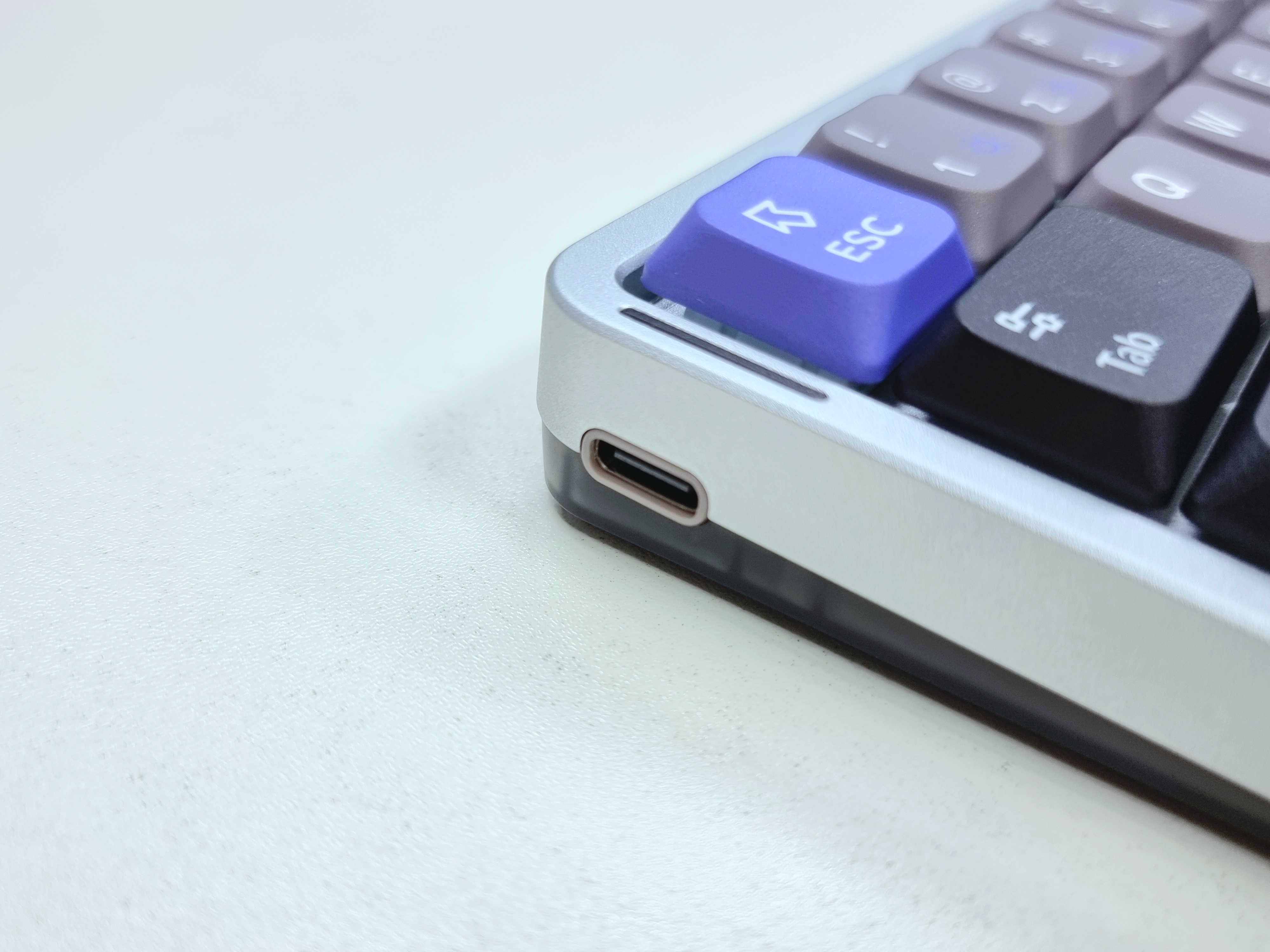 또한, 좌/우측 상단에는 얇은 LED 디퓨저가 적용되어 있으며, 각 측면에는 C타입 포트와 AIR60 HE 로고, 키보드 모드 변경 버튼이 위치해 있어 직관적인 사용이 가능합니다.