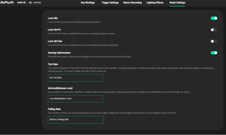 NuPhy AIR60 HE의 웹 대시보드는 브레이킹 샷을 정확하게 쏘기 위한 최적의 기능들을 제공합니다. 키 커스터마이징, 8,000Hz 폴링레이트, 스위치 키압 조정, 매크로 설정, 백라이트 LED 조정, 펌웨어 업데이트 등 여러 기능을 통해 반응 속도와 정확도를 극대화할 수 있습니다. 이 모든 기능들을 활용하면 발로란트와 같은 게임에서 더 빠르고 정확한 반응을 통해 게임 성과를 크게 향상시킬 수 있습니다. 브레이킹 샷을 더 잘 쏠 수 있는 강력한 도구, 바로 NuPhy AIR60 HE 자석축 키보드입니다.
