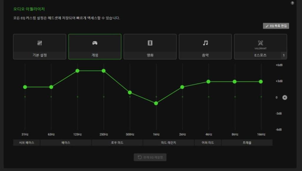 레이저 전용 소프트웨어를 통해 세부 설정도 가능하다. 오디오 EQ는 기본 제공되는 게임, 영화, 음악 모드를 사용할 수 있고, 원하는 대로 직접 커스터마이징할 수도 있다. 또한 마이크 EQ까지 조절할 수 있어 목소리에 맞게 음색을 최적화할 수 있었다. 모니터링 기능으로 직접 들어보며 세팅할 수 있다는 점도 편리했다.