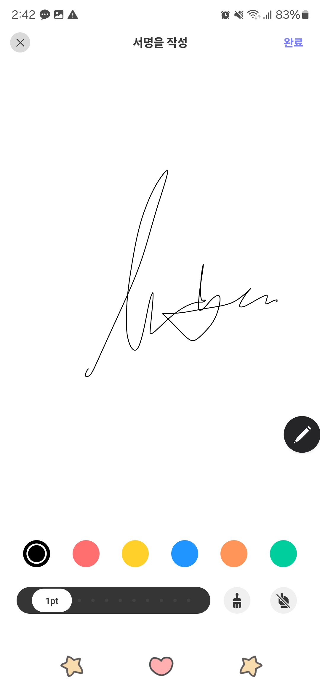 - 손가락 또는 스타일러스로 직접 서명을 입력하거나, 저장된 서명 이미지를 불러옵니다.